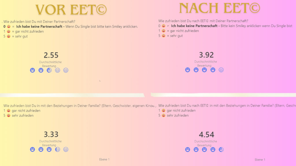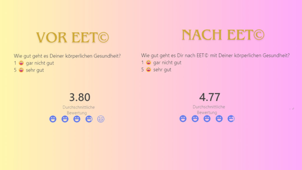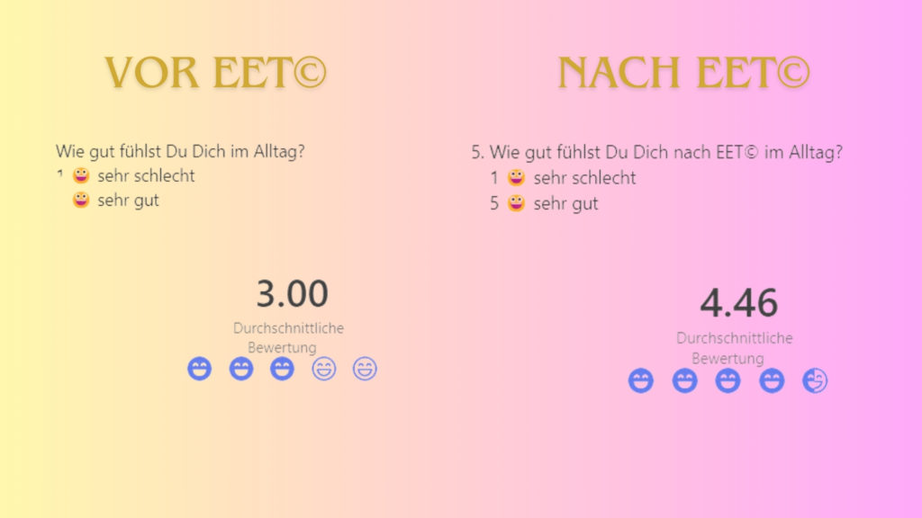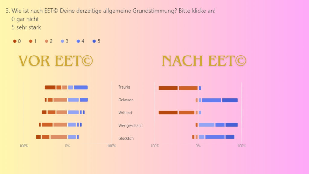 Ergebnisse ermittelt durch Befragung der vielen Klient*innen, die bereits EET© erfahren haben. Der Fragebogen wurde mit Hilfe einer kompetenten Psychologin ausgearbeitet.