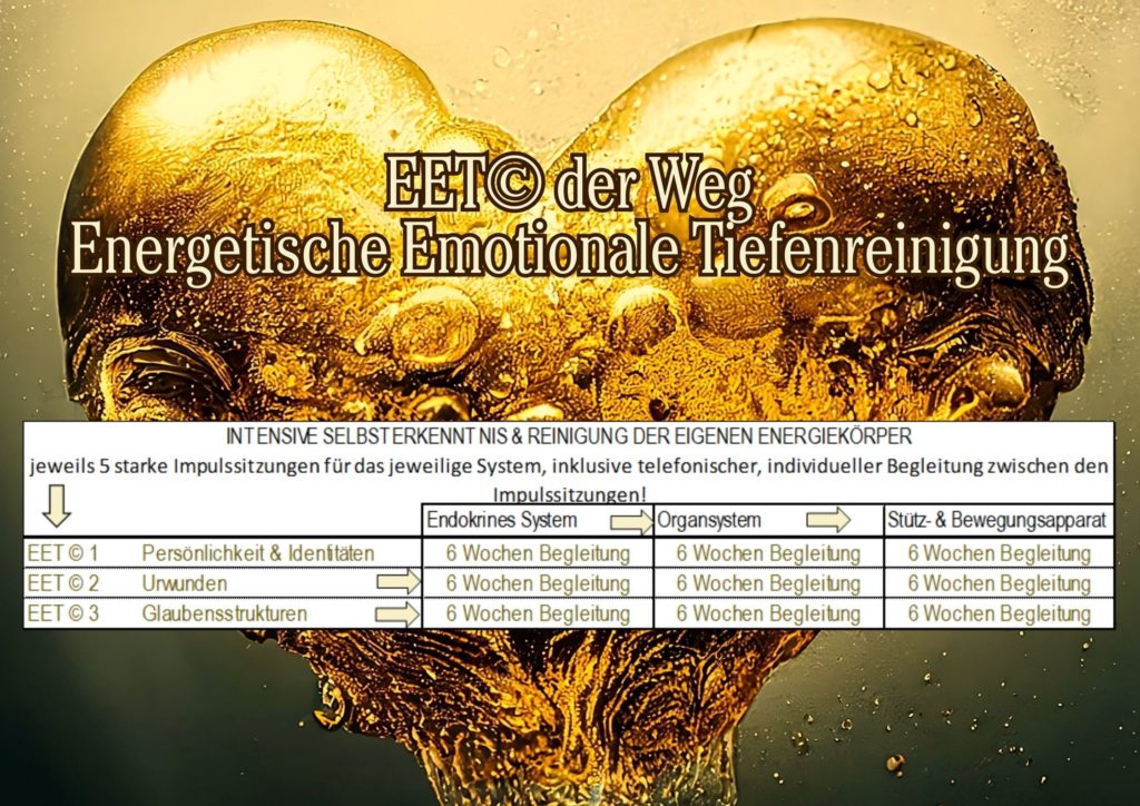 EET© wirkt dort, wo du mit herkömmlichen energetischen Werkzeugen nicht weiterkommst – auf der unbewussten Ebene, die dein Verstand oft ausblendet, verleugnet oder verdrängt hat. Es löst tief verborgene Blockaden und bringt dich über scheinbar unüberwindbare Hindernisse hinweg. Es öffnet die Grenzen von innen nach außen und hilft dir, deine eigenen Begrenzungen zu überwinden, sodass du dich frei entfalten und dein volles Kraftpotenzial, freie bedingungslose Verbindungen und berufliche Fähigkeiten in Liebe, Freude und Leichtigkeit leben kannst.